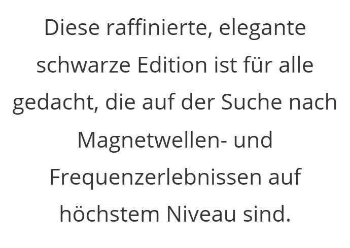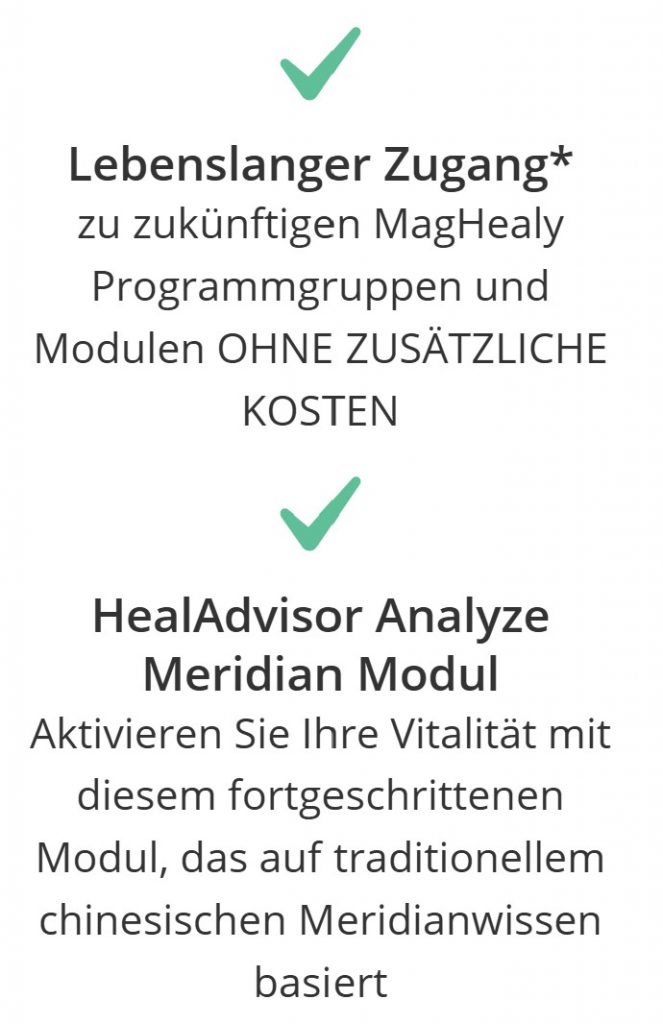 Die Magnetfeldprogramme des MagHealy sind keine medizinischen Anwendungen. Sie sind nicht dazu bestimmt, Krankheiten zu heilen, zu behandeln, zu lindern, zu diagnostizieren oder zu verhindern. Die in den Programmen verwendeten Begriffe stellen keine Aussagen über deren Wirkungen dar. Die Programme sollen dem Anwender ein Werkzeug an die Hand geben, mit dem er Anwendungsmöglichkeiten erkunden kann. Die MagHealy Programme sollten nicht als Ersatz für professionelle medizinische Beratung, Diagnose oder Behandlung angesehen werden. Du solltest dich immer von einem qualifizierten Arzt beraten lassen. Wenn du eine Krankheit hast oder vermutest, dass du eine haben könntest, oder wenn du von einem Arzt behandelt wirst, solltest du deinen Arzt konsultieren, bevor du MagHealy benutzt. Verwende dein MagHealy immer gemäß der Bedienungsanleitung.
